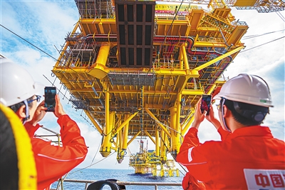 技术人员在记录“深海一号”二期工程综合处理平台水上生产组块吊装。(资料图)