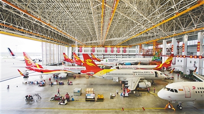 在海南自贸港一站式飞机维修产业基地定检机库,工作人员在各自岗位上作业。(资料图)