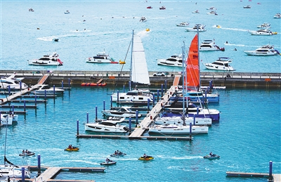 7月22日,三亚半山半岛帆船港附近海域,游客体验水上项目,尽享滨海夏日的清凉与欢乐。