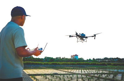 在三亚崖州区国家野生稻种质资源圃物种展示区,科技人员操控无人机对野生稻进行精准施肥。海南日报全媒体记者 张茂 摄