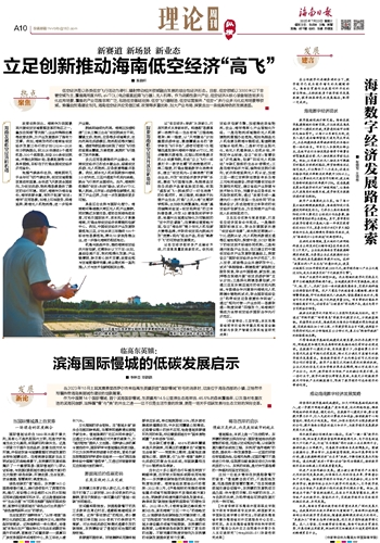 ■ 陈晓昕低空经济是以各类低空飞行活动为牵引,辐射带动相关领域融合发展的综合性经济形态。目前,低空领域以3000米以下非管空域为主,覆盖商用直升机、eVTOL(电动垂直起降飞行器)、无人机等。作为战略性新兴产业,低空经济从核心装备制造到多元化应用场景,覆盖的产业范围非常广泛,包括低空基础设施、低空飞行器制造、低空运营服务、“低空+”多行业多元化应用场景等领域。乘着自贸港建设东风,海南低空经济应凭借区域、政策等多重优势,加大产业布局,探索走出一条独具特色的发展道路。
