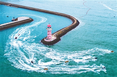 7月22日,在三亚半山半岛帆船港附近海域,游客感受海上的速度与激情,尽情享受三亚滨海夏日的清凉与欢乐。
