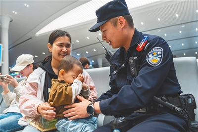 ③ 乌鲁木齐铁路公安处乌鲁木齐站派出所民警向带小孩的旅客提示乘车安全。本专栏图片均由新华社发