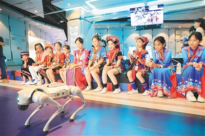 图为五指山市雨林童声合唱团探秘长春时空旅程人工智能科技体验馆。