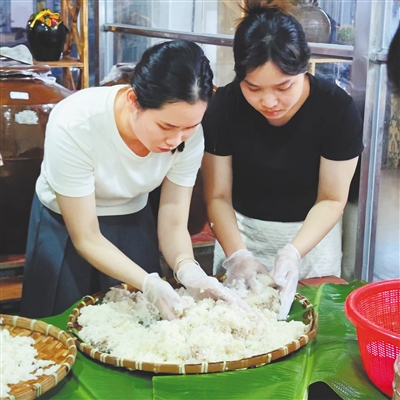 ② 在抱由镇酿酒基地,两名青年体验山栏酒酿造过程。
