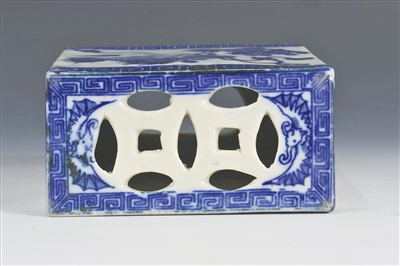 清代青花双狮戏球瓷枕。 海南省博物馆藏