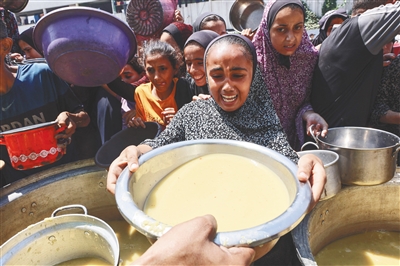 7月25日,一名女孩在加沙城领取食物。目前加沙地带饥荒日益严重。
