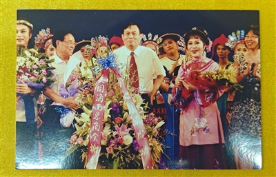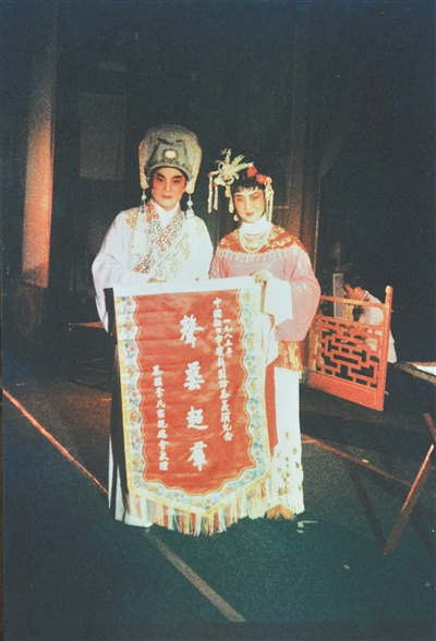 1985年,琼剧演员陈振安(左)、黄庆萍在泰国演出后获得华侨赠送的锦旗。陈怡翻拍
