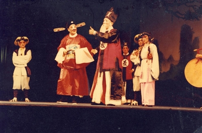 1982年,梁家樑、李桂琴等在新加坡表演琼剧《七品芝麻官》。资料图