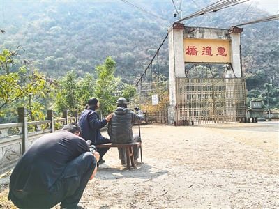 2025年2月,摄制组在滇缅公路惠通桥取景。桥头有海南籍南侨机工翁家贵雕像,雕像作者李春华坐在一旁。受访者供图