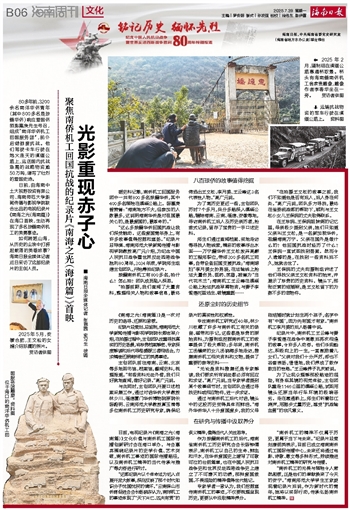 日前,由海南中土大视野投资有限公司、海南师范大学新闻传播与影视学院联合出品的电视纪录片《南海之光(海南篇)》在海口首映,生动再现了多名琼籍南侨机工的英勇事迹。