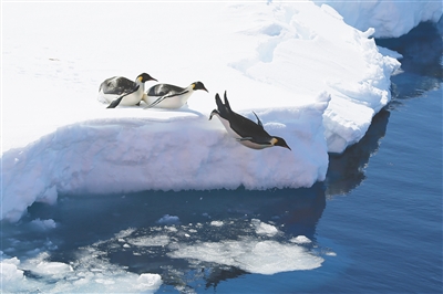 生活在南极的帝企鹅从浮冰上跳入海中。新华社发
