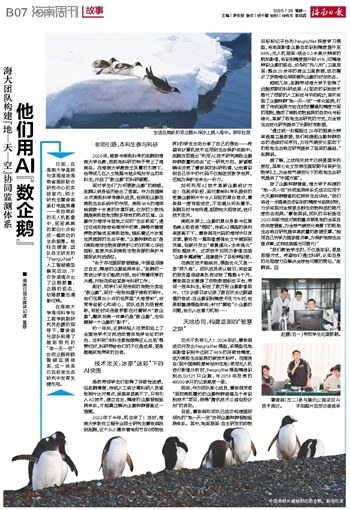 ■ 海南日报全媒体记者 黄婷日前,在海南大学蓝碳与滨海湿地海南省国际联合研究中心的实验室内,硕士研究生覃俊淇紧盯电脑屏幕——来自南极的无人机影像中,密密麻麻的黑白小点构成一幅灵动的生命图景。他轻击键盘,团队自主研发的“PenguiNet”人工智能模型瞬间启动,不仅快速清点出了企鹅数量,企鹅的姿态、幼雏数量也清晰可辨。