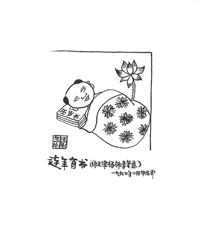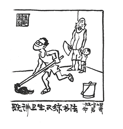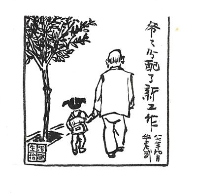 祖孙生活是华君武最富有生活意趣的漫画主题之一。例如,《爷爷分配了新工作》,描绘了退休老人送孩子上学的隔代带娃现象;《孙子好威风,爷爷口袋空》中,在国庆大酬宾的广告宣传下,爷爷给孙子买了大量玩具导致荷包变空,最后举双手投降;《爷爷和画眉、爸爸和我》中,爸爸和爷爷两辆自行车后座上,孙女与画眉鸟两相对照,趣味盎然。
