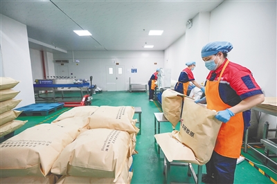 近日,在海口国家高新区美安生态科技新城,海南华研胶原科技股份有限公司包装车间的工人加紧打包准备外销的胶原蛋白肽粉。