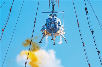 “月球重力约为地球重力的六分之一。”王晓磊说,搭建塔架和随动系统等的目的,就是在地球上模拟月球重力。着陆器下方地面上铺了一层沙,有的地方放置了石头,有的区域高低不平。“与月球表面的月壤、陨石坑等环境具有一定相似性。”王晓磊说,只有一块地方是平坦的安全区,目的就是让着陆器识别并避开障碍,自主选择合适的降落地点。