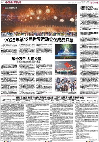 新华社成都8月7日电 8月7日,2025年第12届世界运动会在四川省成都市开幕。国务委员谌贻琴出席开幕式并宣布开幕。夜幕下,成都天府国际会议中心华灯璀璨,流光溢彩。20时,世运会开幕式开始,伴随着欢快的旋律,来自116个国家/地区的参赛人员依次入场。国际奥委会主席考文垂视频致辞,成都世运会组委会主席、国家体育总局局长高志丹,国际世运会协会主席佩鲁雷纳致辞。21时20分,谌贻琴宣布:成都2025年第12届世界运动会开幕!全场响起热烈掌声。