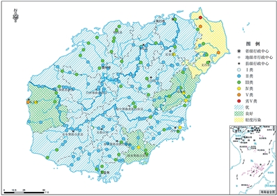 全省地表水水质总体为优,191个1省控监测断面(点位)的水质优良(Ⅰ~Ⅲ类)比例为94.8%,同比持平;劣Ⅴ类比例为0.5%,同比上升0.5个百分点。19个市县中,文昌市水质轻度污染,琼海市、东方市和陵水黎族自治县水质良好,其余市县水质为优。
