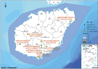 全省主要森林旅游区空气负离子浓度均优于世界卫生组织规定清新空气1000个~1500个/立方厘米的标准,对人体健康有利。其中,霸王岭空气负离子平均浓度为3944个/立方厘米、尖峰岭为3221个/立方厘米、五指山为3610个/立方厘米、七仙岭为1670个/立方厘米、铜鼓岭为1638个/立方厘米、吊罗山为4417个/立方厘米、呀诺达为5836个/立方厘米、亚龙湾为2090个/立方厘米。