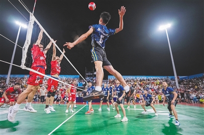 8月10日晚,在2025年“九九杯”海南(文昌)乡镇排球联赛决赛上,澄迈金江镇咖啡队的队员扣球。