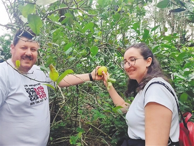 近日,挪威客人Nils(尼尔斯,右一)和Andreas正在体验采摘橘红。受访者供图