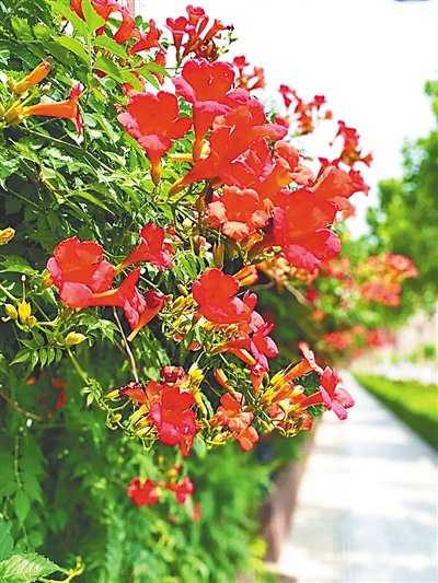 最初听说凌霄花,是年少时听到的舒婷《致橡树》:“我如果爱你/绝不像攀援的凌霄花/借你的高枝炫耀自己……”那时的我还不知道凌霄花是什么样子,但我感觉但凡被称为花,应该都是美的。诗人诗句里不屑效仿凌霄花的缘由,我不太懂,并且固执己见地认为花儿以哪种方式绽放,应该是花的自由。第一次见识凌霄花,是多年前某个夏日傍晚,熟识植物学的朋友亚平约我去游园,带我去看最美的花。只一眼,我就被惊到了。在长长的人工栅栏上,缠绕着密密匝匝的墨绿枝蔓,层层叠叠形成厚实花墙。众多喇叭般硕大的橙红花朵点缀在绿浪间,美艳得大气磅礴、动人心魄。原来这就是凌霄花!