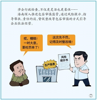 案例注解9月1日起,《海南省涉企行政检查条例(试行)》(以下简称《条例》)将正式施行,系全国首次以地方性法规形式对涉企行政检查作出严格规范。《条例》通过实施分级分类监管、统筹实施“综合查一次”、全面推行“亮码检查”、深入推进包容审慎监管、推进实施非现场监管、加强数据归集共享等举措,进一步优化涉企行政检查方式方法,最大限度减少入企检查的频次。