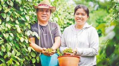 正值胡椒收获的时节。连日来,海口市琼山区大坡镇,海南农垦胡椒种植基地里,一串串饱满的胡椒果实挂满枝头,职工忙碌采摘,享受丰收的喜悦。
