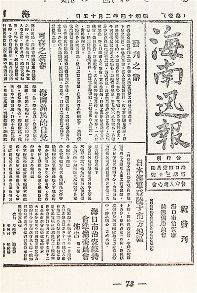 为了将日本的侵占合理化,日本在此时期还出版了一系列报纸与刊物。其中最早创办的是《海南迅报》,用中文发行,以宣传日军的“宣抚”活动。此后,日本人还创办了《海南新闻》。1943年,《海南新闻》与《海南迅报》合并,并委托日本每日新闻社来经营。