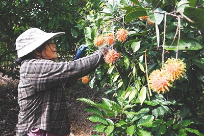 物以稀为贵。近年来,保亭敏锐捕捉到国内高品质水果市场需求攀升的商机,扶持推广红毛丹规模化种植,并积极申报地理标志和证明商标,保亭“红毛丹之乡”品牌形象逐步树立。“保亭红毛丹”先后获得国家地理标志证明商标、国家地理标志保护产品,并列入农业农村部精品农业品牌培育计划,逐步向北京、广州、深圳等国内大城市拓展市场。如今,红毛丹种植面积逐年扩大,亩产量高价格稳,是保亭当地农民的“致富果”。