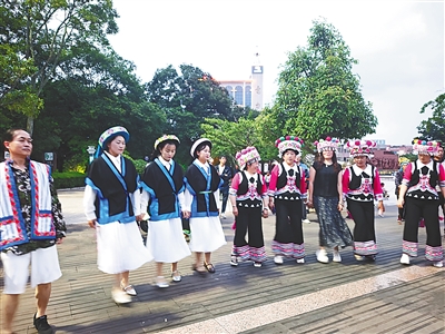 寻甸县城广场上载歌载舞的少数民族同胞。 冯勇 摄