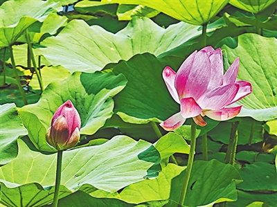 从亭子间出来,我打开手机搜索《荷塘月色》这首歌,调低音量,一边走一边听“剪一段时光缓缓流淌,流进了月色中微微荡漾……”暖风吹拂,身旁的荷叶与荷叶耳鬓厮磨,呢喃细语。