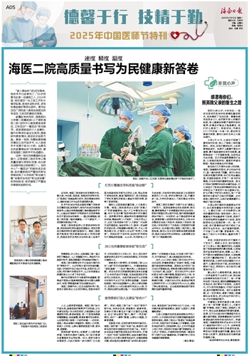 从惊心动魄的创伤急救到润物无声的人文关怀,从引领前沿的技术突破到辐射基层的医联体建设,海医二院正以“医者红”党建品牌为引领,在医疗技术的高峰上不断攀登,在服务体验的细节上持续深耕,在人文关怀的温度上用心守护,用实际行动践行着“明德致知,齐心济众”的院训,为海南百姓构筑起一道坚实的“大病不出岛”健康防线,书写着守护人民生命健康的崭新篇章。