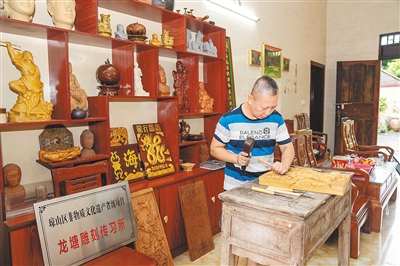 8月18日,海口市琼山区龙塘镇文彩村,海口市第八批市级非物质文化遗产代表性传承人王名强正在创作木雕作品。