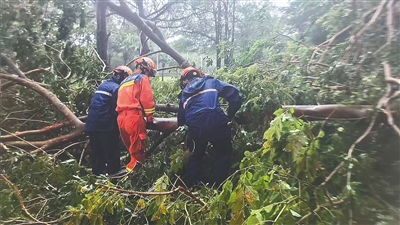 8月24日,三亚市吉阳区亚龙湾附近道路有多株树木被大风刮倒,三亚消防救援支队迅速调派力量赶赴处置。通讯员 付乐 摄