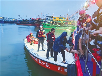 8月24日,三亚消防救援人员在崖州区中心渔港码头,对因台风滞留渔船人员进行转移。通讯员 莫文彬 摄