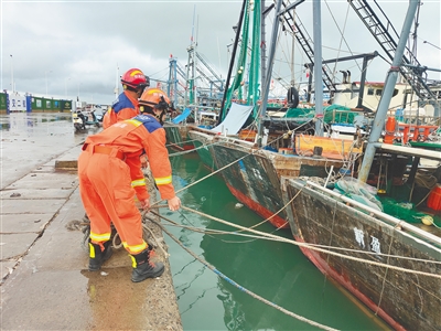 8月24日,临高消防救援人员在新盈中心渔港开展船只防台风巡查工作。