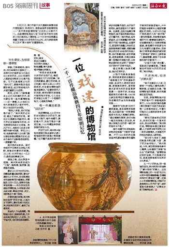 历史厅正中,吴开英兴奋地向海南日报全媒体记者介绍馆陈的明代琼剧人物琉璃罐。“这只罐子是我的高中同学多年前赠予我的,由于找不到用处,躺在家里许久不曾问津。没承想,当我开始筹办博物馆时,脑子里突然就浮现出这只罐子来。”吴开英说,经专家鉴定,这只琉璃罐为明代晚期万宁琉川窑烧制品,全国罕见,更宝贵的是罐上所绘的正是琼剧表演的情景,细腻地雕琢出两位形态各异的戏曲人物,他们身着戏服,或手持道具,或身姿婀娜,仿佛正演绎着一场精彩的琼剧片段,以实物证据的形式证明了“琼剧产生于明中叶”的学术观点。