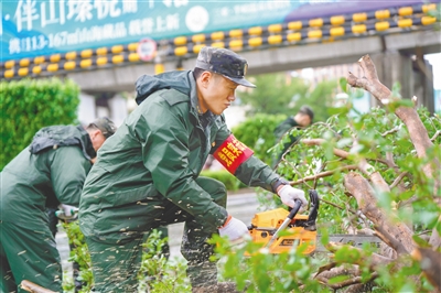 8月25日上午,武警海南总队三亚支队党员突击队在三亚落笔洞路一线清理倒伏树木。