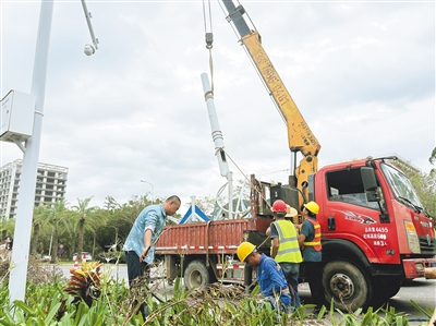 维修工人在移除损坏的灯杆。目前,三亚吉阳大道等多条主干道路灯已经抢修完工。海南日报全媒体记者 刘杰 摄