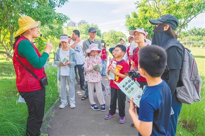 近日,海口市琼山区湿地保护宣教志愿服务活动在美舍河凤翔湿地公园举办。参与者以《琼山区湿地导览图》为工具,探索美舍河凤翔湿地公园的生态奥秘。带队老师详细讲解湿地特有的水生植物和昆虫,帮助大家理解物种与湿地生态系统的依存关系。