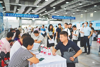 众多求职者手持简历在不同展位前有序排队,与企业招聘负责人热烈交流。“我看好海南自贸港建设前景,希望在海南找到专业对口的工作。”原籍安徽、毕业于南开大学电信工程专业的张智锐投递了求职简历后说道。