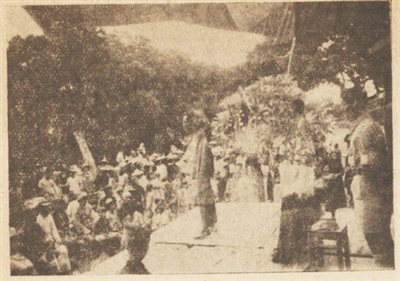 服务团团员在文昌县宝芳乡(今文昌市东阁镇)召开群众大会的场景。