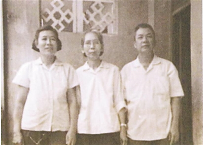 琼侨回乡服务团团员江田夫妇与朱曼英(中)合影。