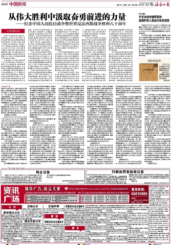 习近平总书记强调:“伟大抗战精神,是中国人民弥足珍贵的精神财富,将永远激励中国人民克服一切艰难险阻、为实现中华民族伟大复兴而奋斗。”今天,中国式现代化已经展开壮美画卷并呈现出无比光明灿烂的前景,中华民族正以不可阻挡的步伐迈向伟大复兴。同时,前进道路不可能一马平川,必须准备经受风高浪急甚至惊涛骇浪的重大考验。我们要保持战略定力,坚定必胜信念,大力弘扬伟大爱国主义精神、伟大抗战精神,保持“越是艰险越向前”的英雄气概,以压倒一切困难而不为困难所压倒的决心和勇气,敢于斗争、善于创造,在自己选择的道路上昂首阔步走下去,把我国发展进步的命运牢牢掌握在自己手中。