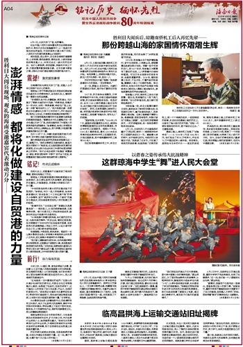 阅兵现场,观众席中,多位来自海南的道德模范、公安英模、模范检察官、模范法官、少数民族参观团等受邀人士,共同见证这一盛大的历史时刻。他们心潮澎湃,深受鼓舞,深感和平来之不易,为国家繁荣富强倍感自豪。这份自豪与振奋之情,正转化为他们建设海南自贸港的强大动力。