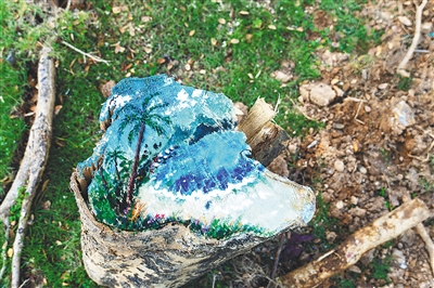图为志愿者在断枝残木上的绘画作品。受访者供图