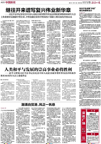 谈及纪念大会上一幕幕场景,南京大学新中国史研究院教授张生心潮澎湃。“和平是发展的前提。习近平总书记强调‘中国人民坚定站在历史正确一边、站在人类文明进步一边’,这一重要论断在当前错综复杂的国际形势下具有现实意义。”张生表示,以史为鉴、面向未来,我们要坚定不移走和平发展道路,为世界注入稳定性和确定性。