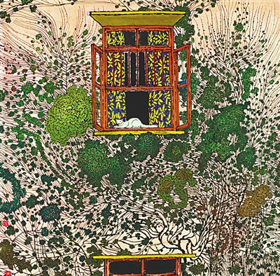 《窗台上的小白猫》(国画)