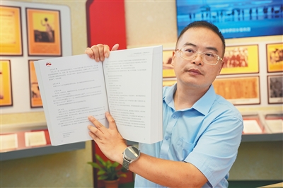刘昌言展示《日军侵华罪证史料——保科德光日记》档案资料。